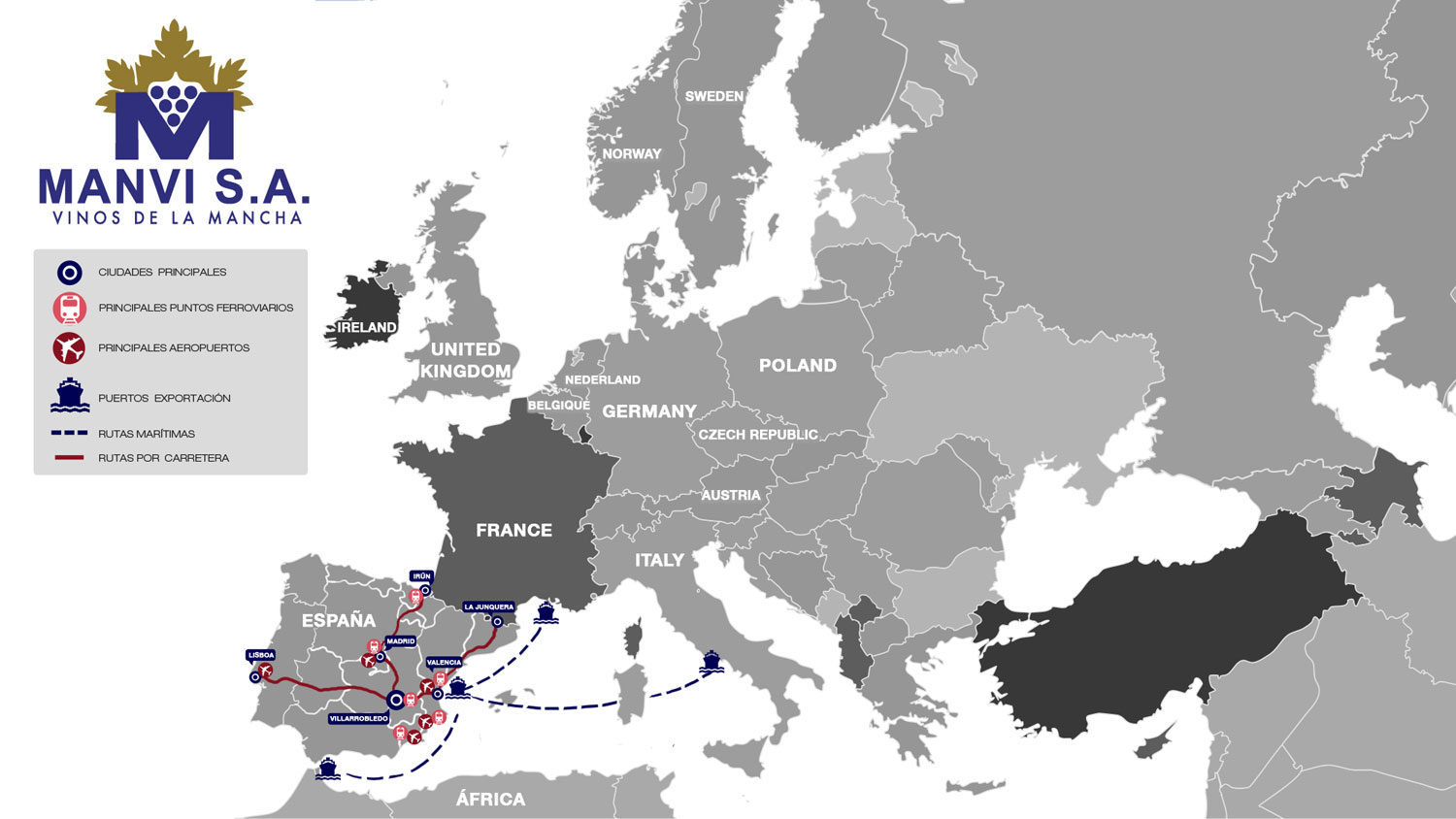 WHERE TO FIND US MANVI is located in Villarrobledo, in the province of Albacete, some 200 kms southeast of Spain's capital, Madrid, and 200 kms from of the Mediterranean port of Valencia, one of the main shipping ports for Spanish wine. It serves as a crossroads for the principal road and rails routes of The Iberian Peninsula.